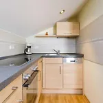 Lägenheten har ett komplett kök samt erbjuder utsikt över trädgården.